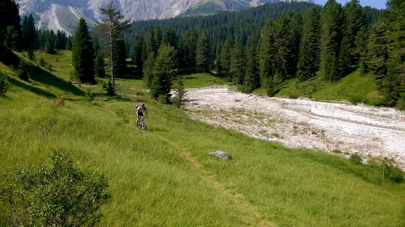 geht’s es sehr steil bergab – zum Teil mit Tragepassagen aber dann schön über Wiesen hinunter nach St. Kassian (1.600 m).