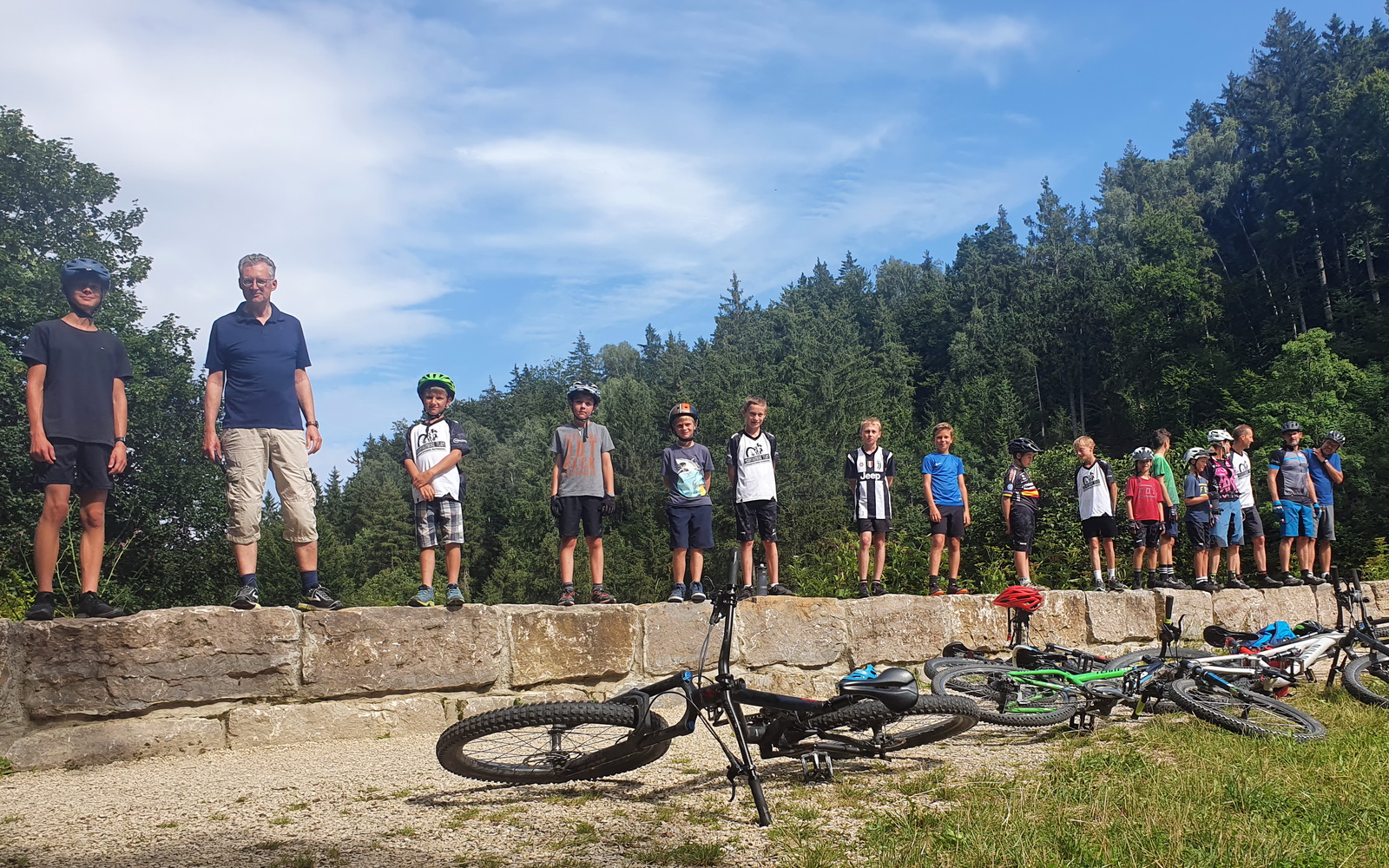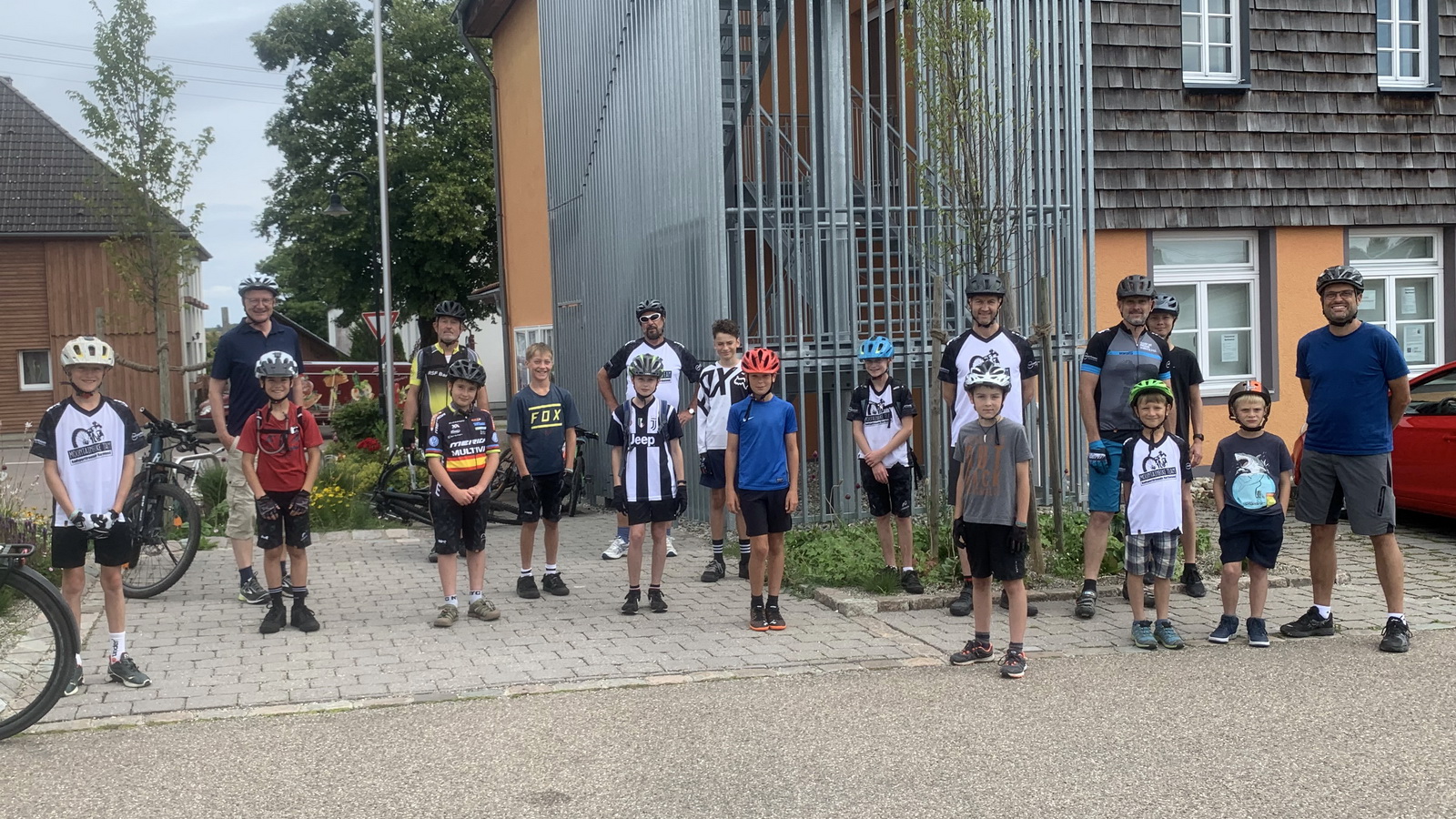 12 Kinder/Jugendliche und 6 Betreuer trafen sich mit Bürgermeister Thomas Kuhn am Rathaus/Dorfhaus zum Start der Radtour.