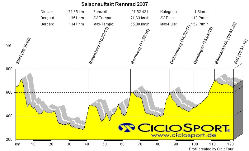 Start: Sonntag, 15.04.2007, 8:30 Uhr bei Siggi (124 km, 1.570 Höhenmeter):